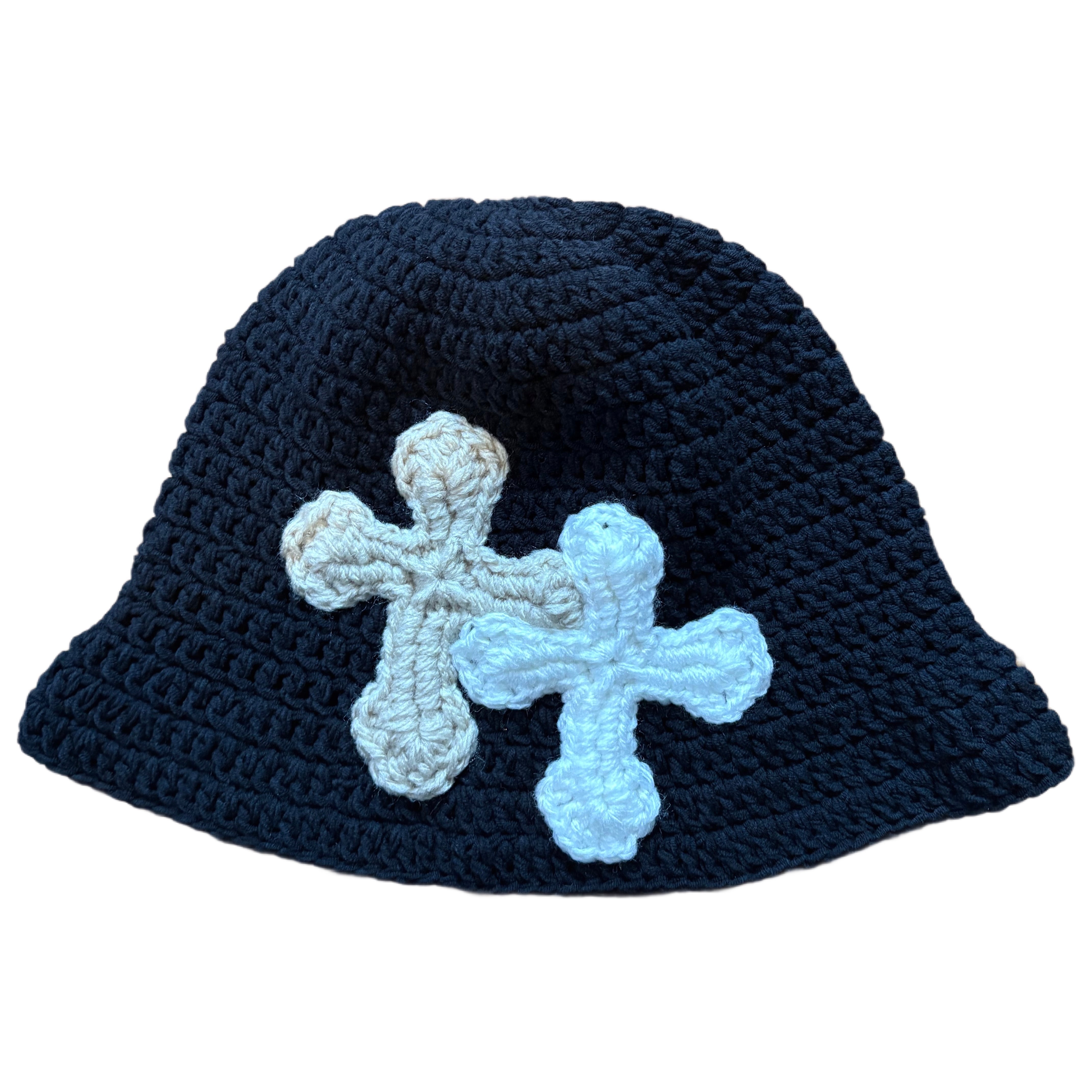 "Y.A.R.N. Collection" 3D double Cross Handmade Knit hat (unisex) BLACK