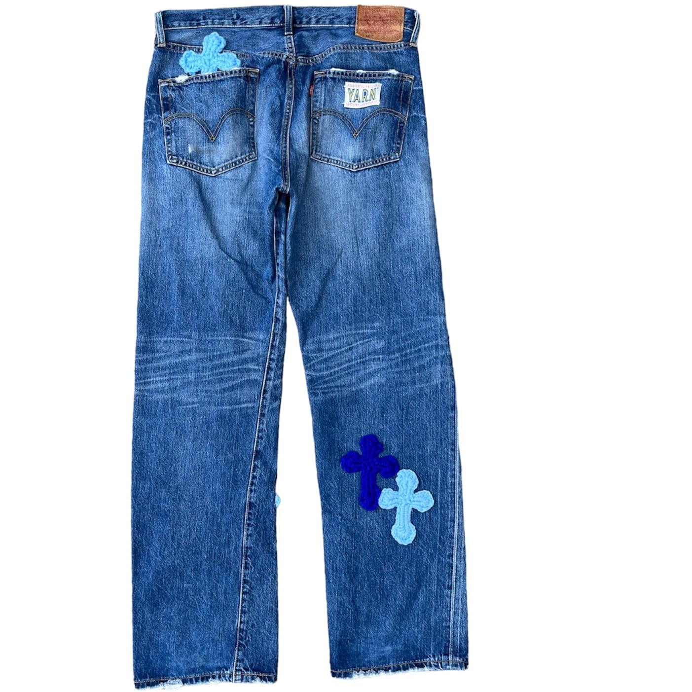 23SS Collection "Y.A.R.N." x Levi's 501 with cross knit motif (blue x light blue)