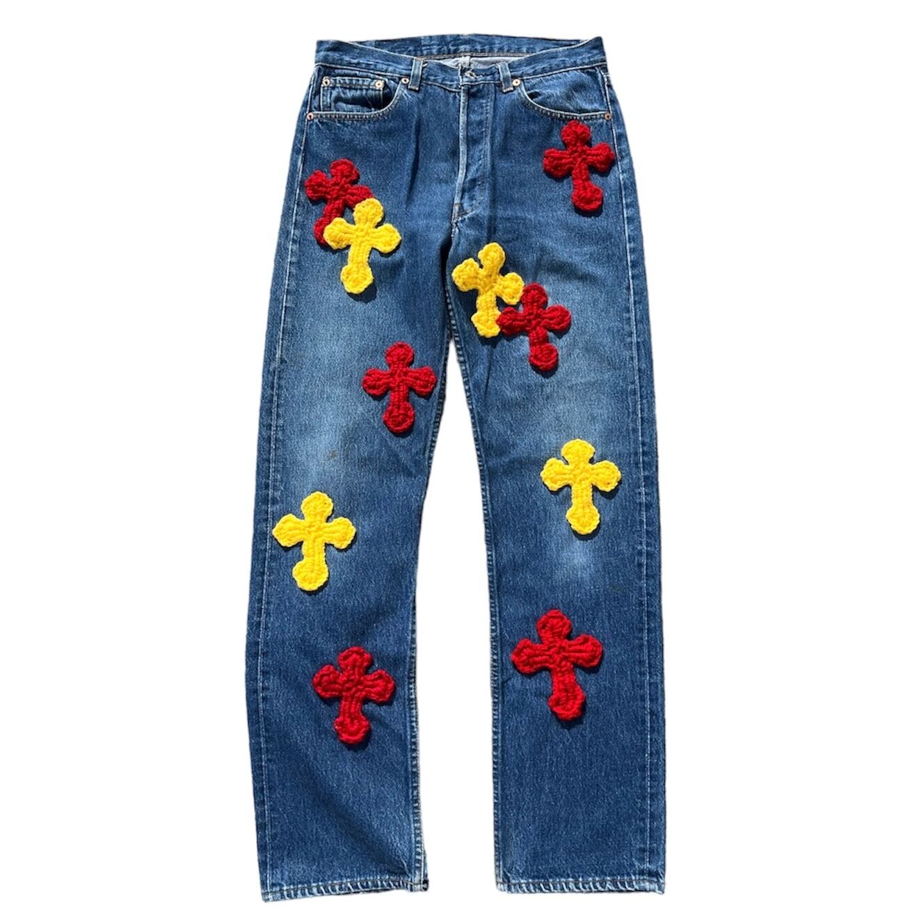 23AW Collection "Y.A.R.N." x Levi's 501 with cross knit motif (red x yellow)